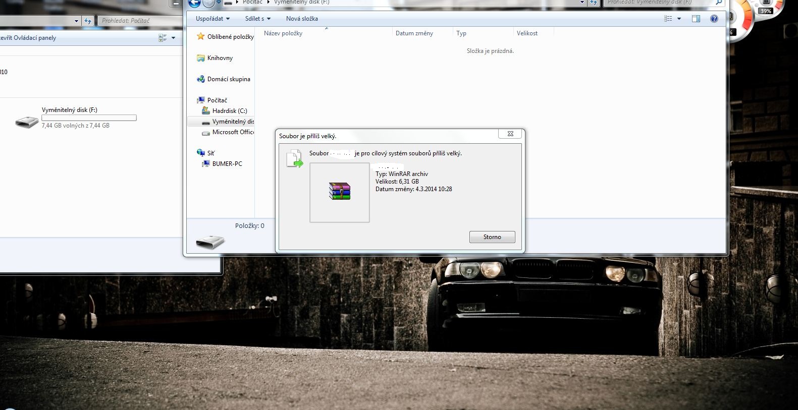 Ahoj. Mám flešku o velikosti 7.4gb Nemůžu tam ale přenést soubor, který má 6.49. Flešku jsem naformátoval, opravil chyby a vyhledal a opravil vvadné sektroy. Vlastnost-nástroje-kontrola chyb. Stále, i když velikost flešky ukazuje 7.4 gb volných, při pokusu o zkopíp´írování mi vyskočí hláška, že na discu není dostatek místa. Kde je chyba? Co mám uudělat? Díky. Win7 home 64bit legální.