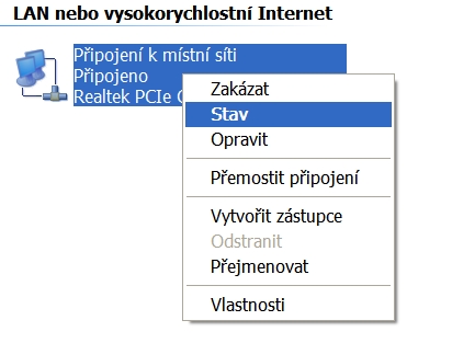 Tady zřejmě došlo ke špatnému pochopení otázky, to se stává. Pokud klikneš pravým myšidlem na STAV u síťového připojení, tak se nic nezobrazí...vůbec nic?