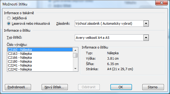 nie je vidiet vysledok :-? zvolíš Možnosti, vybereš velikost štítku (třeba C2160), zvolíš Nový doku…