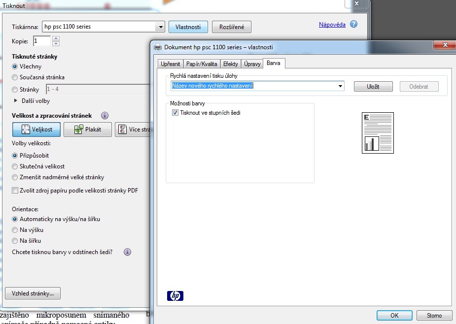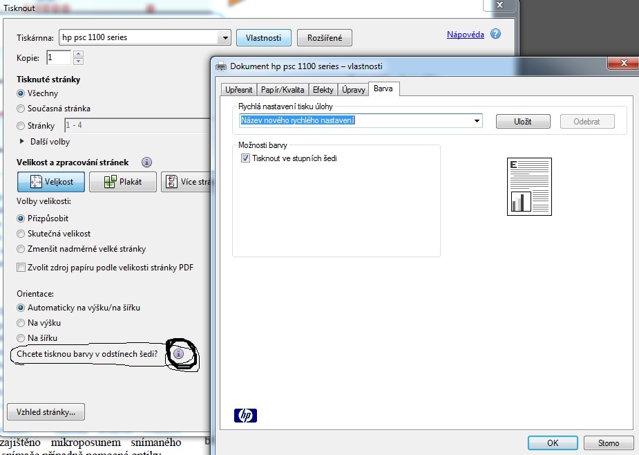 Dobrý den, moje HP psc 1100 series tiskne při nastavení- tisknout ve stupních šedi barevně. Mám spousty listů co potřebuji vytisknout, je tam mnoho obrázků barevných, já už barvu nemám jen zbytky tak to potřebuju vytisknout černobíle, ale furt to tiskne s barvama, které chybí takže je celý obrázek třeba žlutý... doplňují se ty co tam sou. Nevím, kde je problém, proč to nejde vytisknout černobíle.