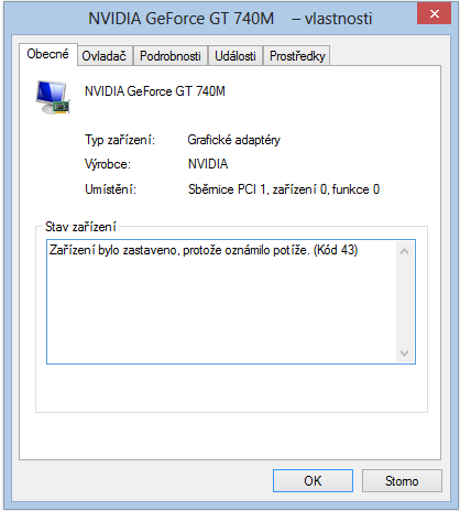 Jako dalším příznakem je to, že mi nefunguje dedikovaná grafika viz obrázek. Tenhle problém se objevil už dříve, tehdy pomohlo přeinstalování ovladačů.