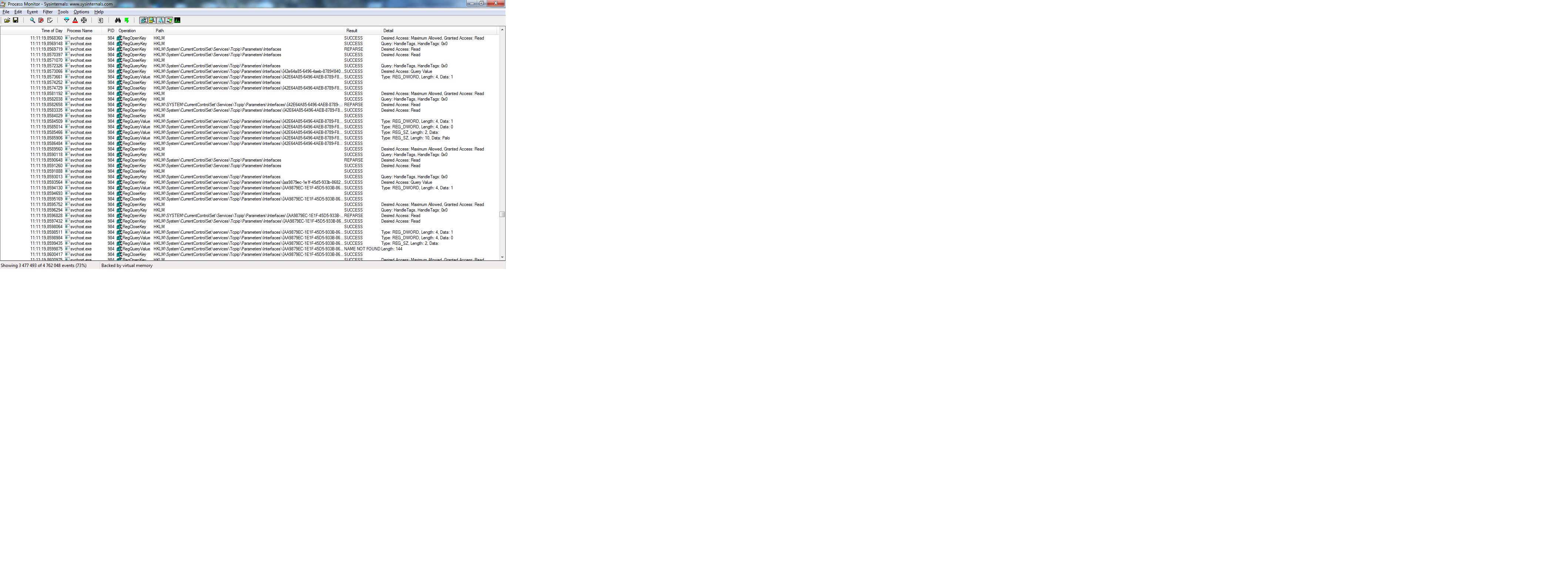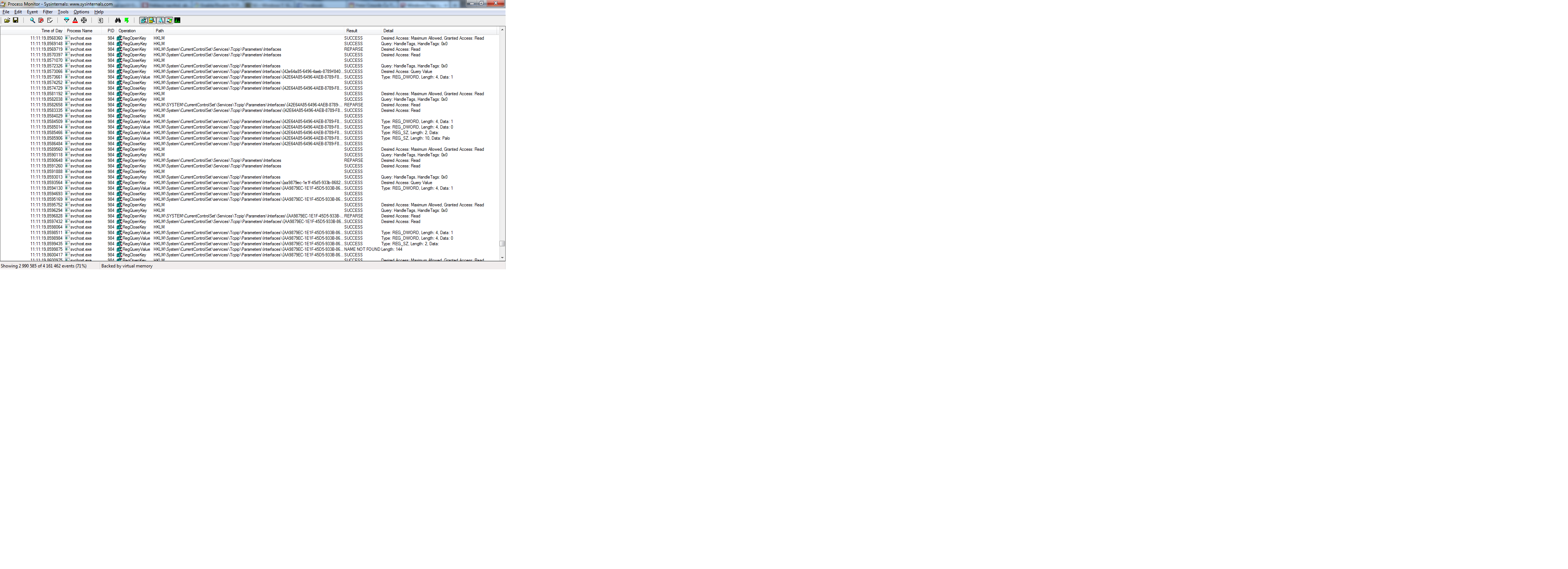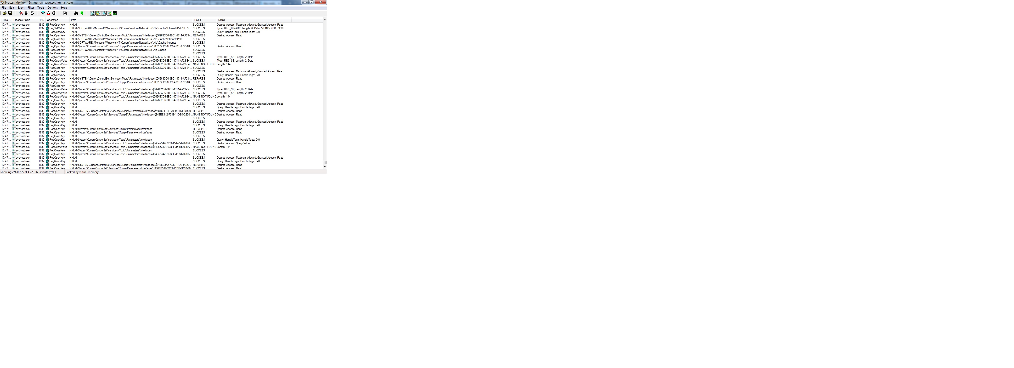 podle obrázku s processmonitorem ti to tuhlo u všech síťovek (interface). podle mě to hledá nějaké neexistující nastavení nebo cestu někam, která neexistuje.