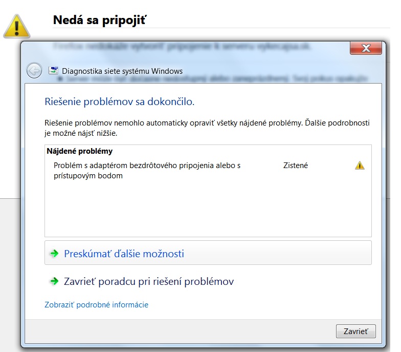 Riešim problém s wifi. Asi posledný mesiac mám skoro každý deň 1-2 krát výpadok. Internet prestane fungovať a objaví sa žltý výkričník. Skúšal som už rôzne návody, čo mi odporúčali ale nepomohlo to. Na mobile a druhom počítači internet funguje, taktiež cez wifi. V prílohe posielam aj screen obrazoviek po kliknutí na riešiť problém. Ďakujem za Vaše rady.