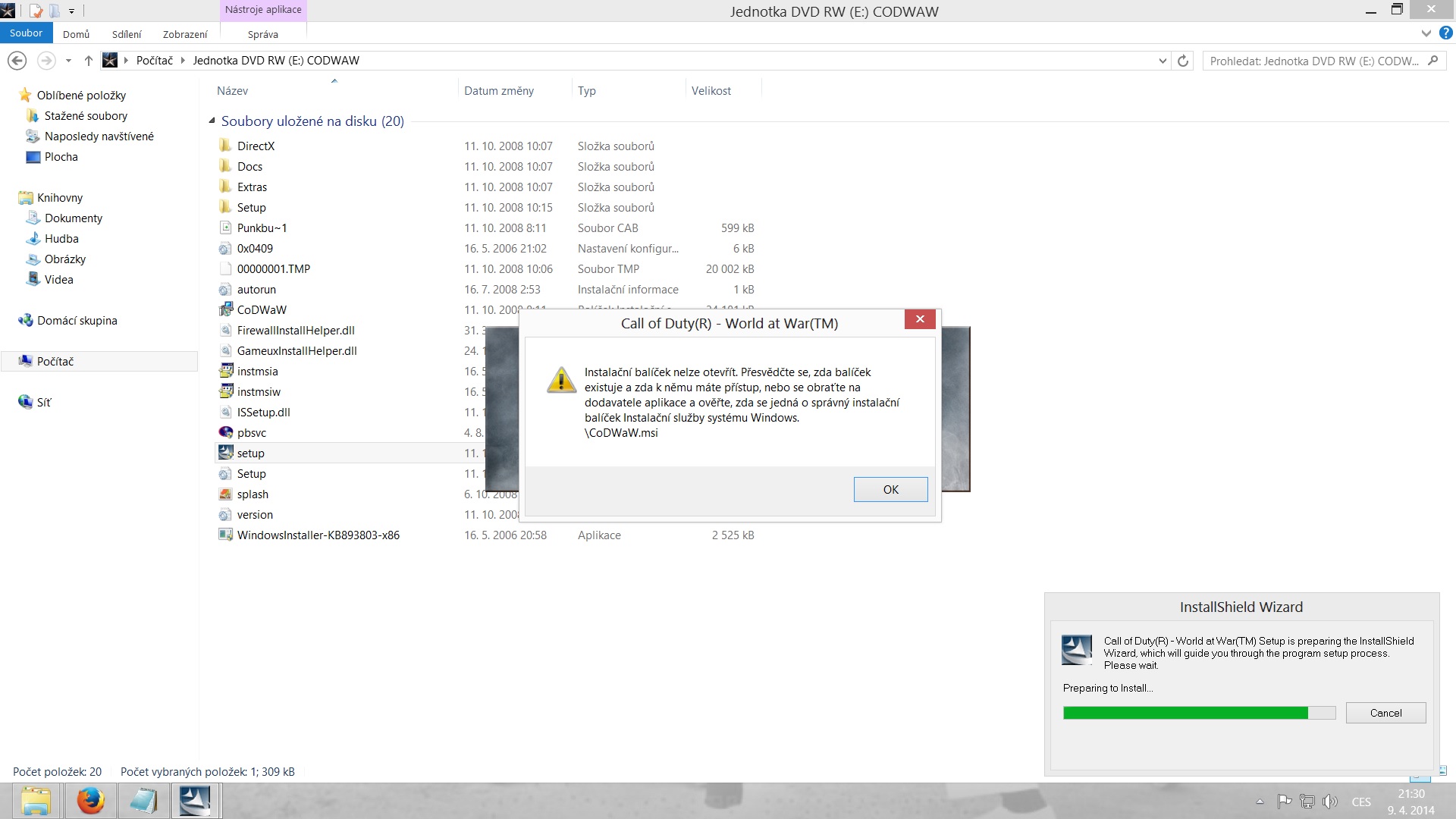 Zkus cvičně z DVD někam na disk překopírovat soubor CoDWaW.msi