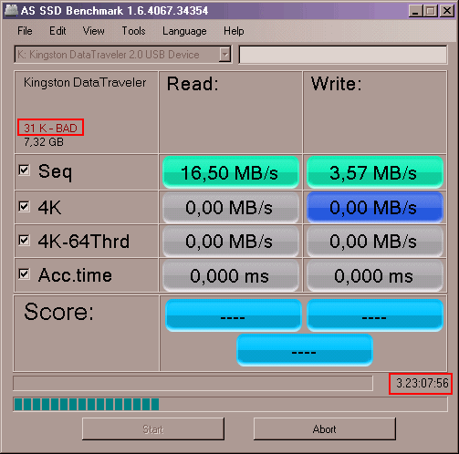 s tím testem máš pravdu. když jsem chybu objevil poprvé, nepochyboval jsem. tato flashka od detekce chyby kromě velkého zpomalení ukazovala i téměř nekonečný zbývající čas testu - je to zjevný shit, jak potvrzuje i wwxww dole.