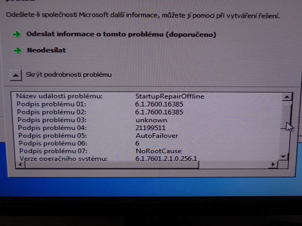 Při běžném spoštění přeskočí na opravu spouštění. Ta bohužel nelze provést kvůli nějaké chybě. (viz příloha)