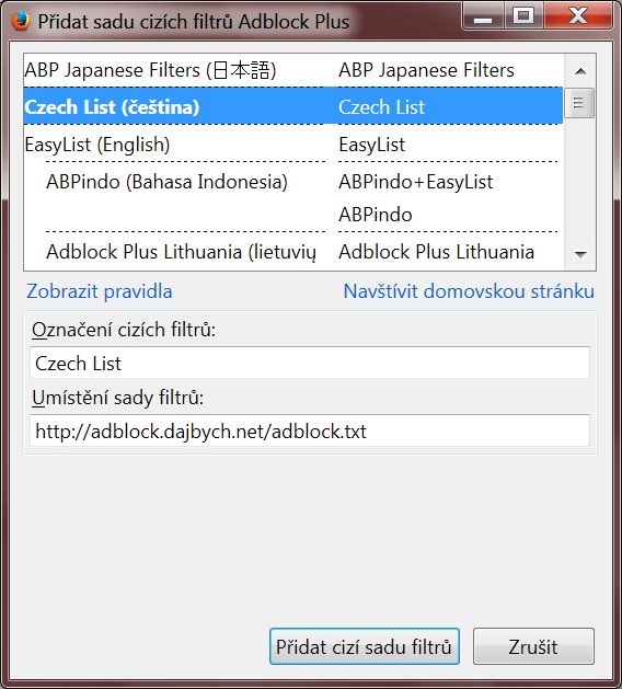 Všechny ty filtry ze screenu vyhoď (včetně toho česko-slovenského paskvilu), akorát to brzdí prohlížeč a je v tom povoleno kdeco. Pak klikni na Odebírané sady cizích filtů - Přidat cizí filtry - Přidat další sadu filtrů - českou sadu Czech List - od Dajbycha. To ti bohatě v našich podmínkách stačí (nějaké si případně můžeš sám vytvořit).