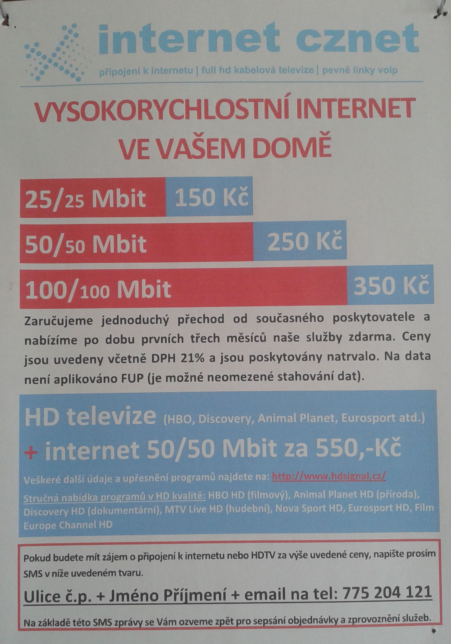 určitě se vyplatí poslat sms na to uvedené číslo, někdo by měl zpětně zavolat, je třeba se ptát jakým způsobem se udělá připojení k internetu do bytu, je třeba vidět smlouvu, jestli je to závazek na nějakou dobu, jak rchle lze vypovědět smlouva..... podle letáčku, tak připojení k internetu je od této firmy www.cznet.cz takže i sem lze zavolat a vyžádat si informace co se u vás konkrétně nabízí