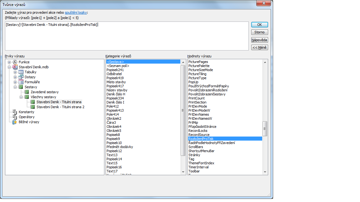 Teď mezitím, co píšu tento status, tak jsem koukal do funkcí v Access 2010 je tam dokonce výraz [RozloženíProTisk]. Ale opět jsem nikde nevygoogloval co mám nastavit za výraz (obrázek 2). Jestli má se výraz rovnat 5 či jakou hodnotu pro oboustranný tisk zvolit.