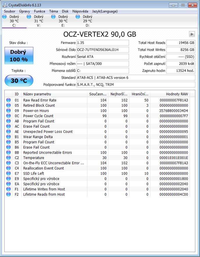 Vlastním SSD: OCZ Vertex 2 90GB má najetých 13 524 hodin. Počet čtení: 19456GB / počet zápisů: 8256… nový