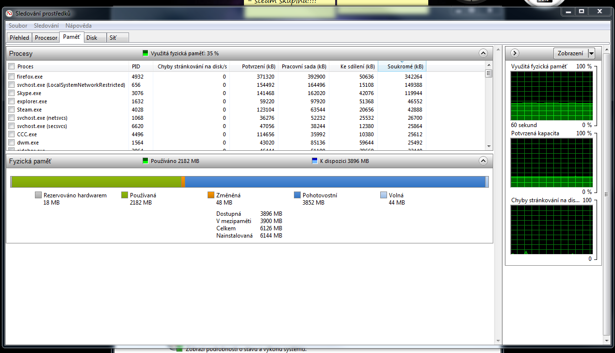 ok, přesto že jsem nedávno odstranil 35 malwerů ( :D ) tak je výkon PC stále velmi špatný... procesor 8% RAM 40% ale hra se seká jak sviňa (ping kolem 30ms takže serverem to neni [snad, myslim]) ale objevil sem že mám 4GB ze 6 RAMky jako pohotovostní <--- je to problém, může to tím být, volná paměť je buď žádná nebo kolem 100MB