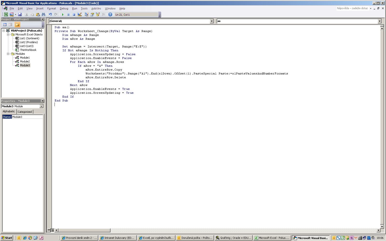 Eh nějak mi to nechodí - vytvořil jsem Makro(pojmenoval jsem ho aa) a vložil do něj tento text a po vyplnění řádku se nic nestane, po znovuotevření je řádek stále na původním listu. Nebo to cpu do makra špatně?