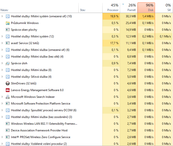 Dobrý den,velice moc bych vás chtěl požádat o pomoc. Už druhý den mám problém s ntb Lenovo U310. Procesor,paměť i disk ukazují vysoká procenta. Ntb jsem přeinstaloval s tím že to problém vyřeší,ale bohužel ne. Také jsem nainstaloval všechny ovladače na novější verze,ale také marně. Nárůst procent asi nejvíce ovlivňuje Hostitel služby.Zde dávám i PrtSc. Budu velice rád pokud mi s tímto problémem poradíte.Pokud budou zapotřebí nějaké informace,tak je zašlu. Velice děkuji