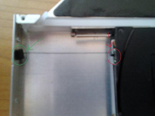 Vzadu šuplíku je spínač (viz. červení kroužek) který se po zavření zmáčkne o zadní stěnu mechaniky. Bohužel nějak mezi zadní stěnou a šuplíkem vznikla velká mezera a spínač nesepnul. Stačilo na zadní stěnu nalepit kousek gumy (viz. zelení kroužek) a je po problému.