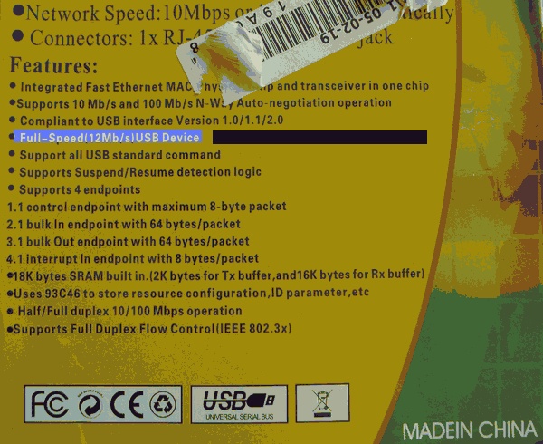 Kdyby ten adaptér jel na USB 1.1, tak jeho rychlost bude max 900 kb/s. Takže opravdu jede na USB 2.x. Je tam nějaký pomalý čip, už velikost TX bufferu mluví za vše. Podle krabičky se nedá poznat jakou rychlost bude adaptér mít. Běžně používám USB karty s čipy Asix (AX88772, AX88178, AX88179) a s rychlostí problémy nemám. Na druhé straně cena nejde pod 200,- Kč. Inu, ušetřil jsi :-)