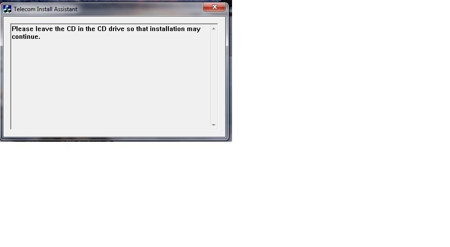 okno je nazvano Telecom install Assistant a je v nem napsano"Please leave the CD in the CD drive so that instalation may continue."
