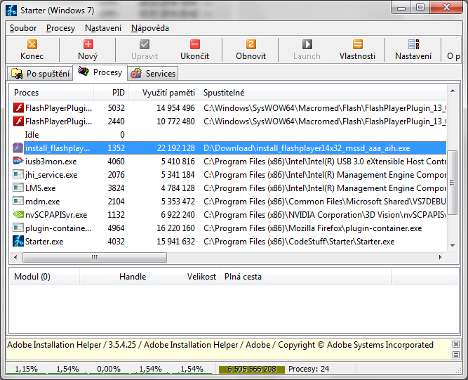 Ze stránky flashplayer se stáhne online instalátor, install_flashplayer14x32_mssd_aaa_aih.exe, ale po jeho spuštění (jako správce) se nestane vůbec nic. Stáhl jsem tedy celý Adobe Flash 14.0.0.125, nainstaloval, hlídač aktualizací je spokojen, hlásí aktuální verzi.
