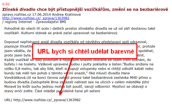 V tom hledám složitosti, jak obarvit adresu. Jde jen o to, jak to čtu odspodu, abych viděl, že má článek URL, takže jsem si přidal do uživatelského konvertoru, aby se URL nahradilo za <url>URL</url>, to si pak nastyloval, aby to bylo dobře vidět.