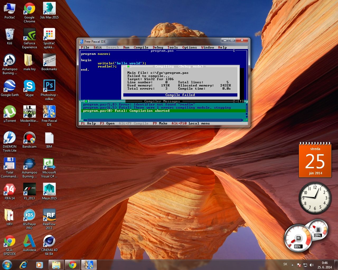 Potrebujem kompilator na Pascal. Pozri si to video, co som ti poslal dnes o polnoci. Kedze by som rad postupoval dalej v jeho tutorialoch, tak by bolo dobre, ak by som to mal ako on. Napisem si program v niecom ci uz v textovom dokumente akebo v Dev Pascale, uloxim subor pas na plochu, otvorim v programe Free Pascal a skompilujem. To su moje zivotne ciele