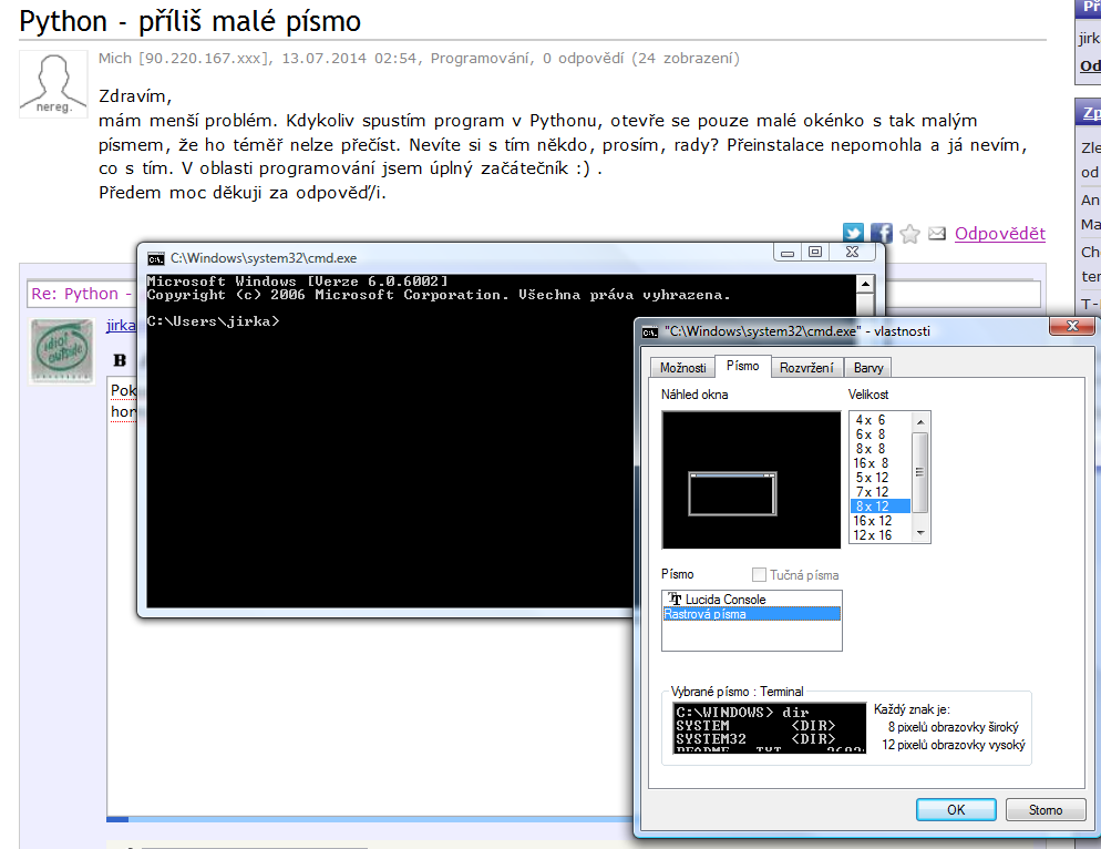 Pokud tím okénkem myslíš okno příkazového řádku ve Windows (cmd.exe), tak klikni pravým myšem na horní okraj okna a ve Vlastnostech si nastav rozměr okna, velikost písma a třeba i barvu.