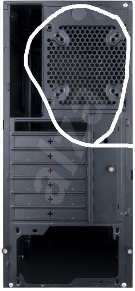 Dále otočit přední ventilátor tak, aby vháněl vzduch do skříně, tím pádem bude ofukovat pasiv čipsetu. Změřit rozteč děr pro šrouby na zadní pozici ventilátoru, ale pravděpodobně tam bude sedět jakýkoliv ø120 mm ventilátor.