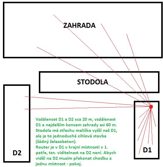 Jaké je prosím nejlepší bezdrátové řešení, jak rozvést signál do vyznačených prostor (viz červené čáry na nákresu)? Tahání kabelů není možné. Je třeba ještě uvést, že D2 (dům 2) je přízemní a signál nemusí být všude, stačí mi jen 1/3 domu. Pokud bych umístil něco na střechu D1 (domu 1) což možné je (plochá střecha a můžu tam dát cokoliv), tak si nejsem jist, jestli budu mít zase pokrytý celý D1. Myslel jsem, že bych koupil jiný router, např. s více anténami a jedna by byla pro pokrytí D1 a další by šla např. na střechu a pokryla zbytek. Otázka je, jestli je nějaká taková anténa, která zvládne pokrýt takový úhel.