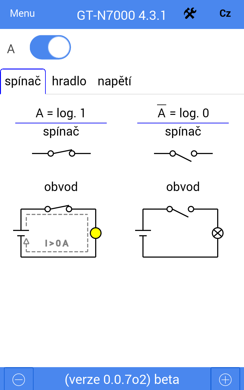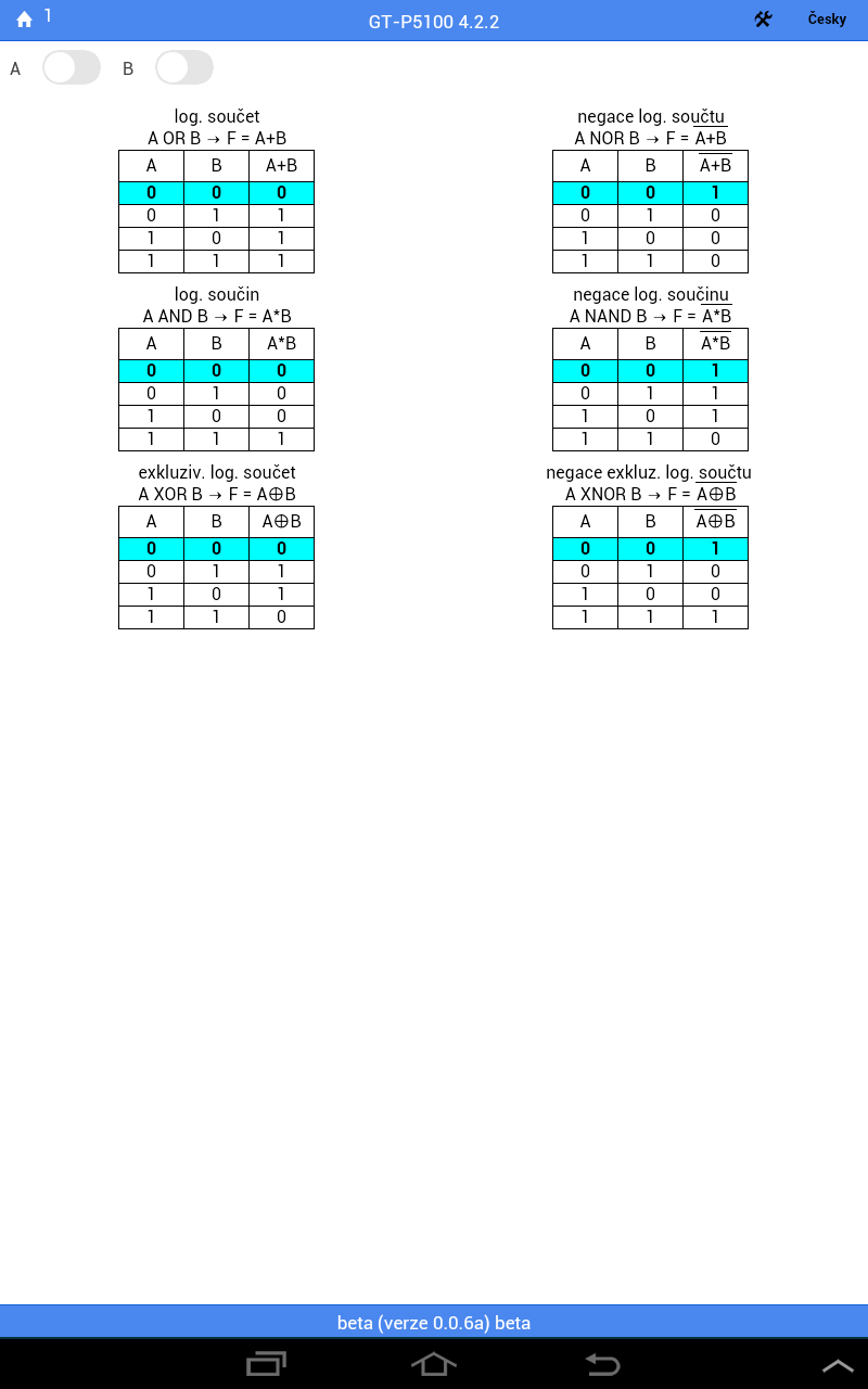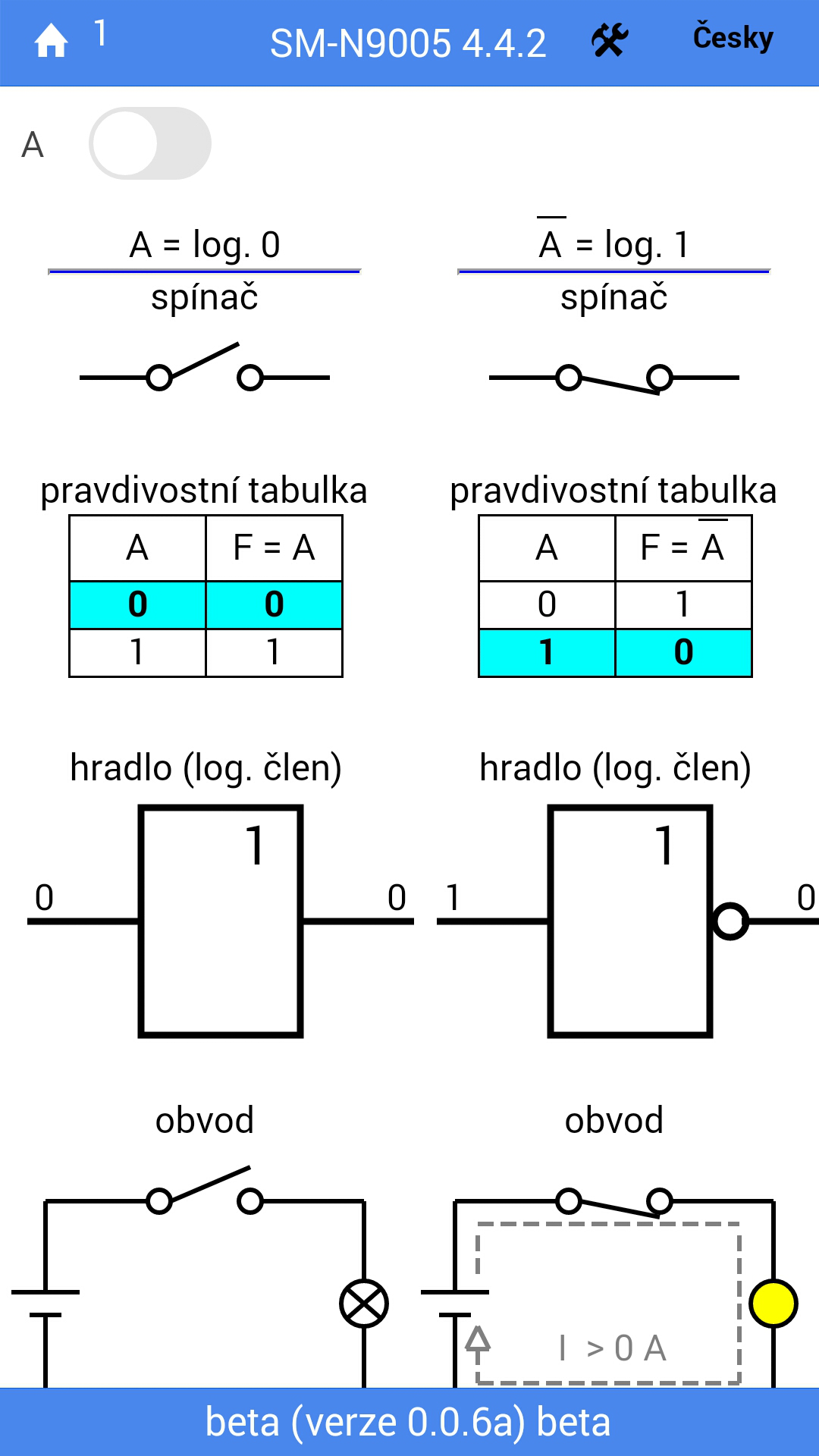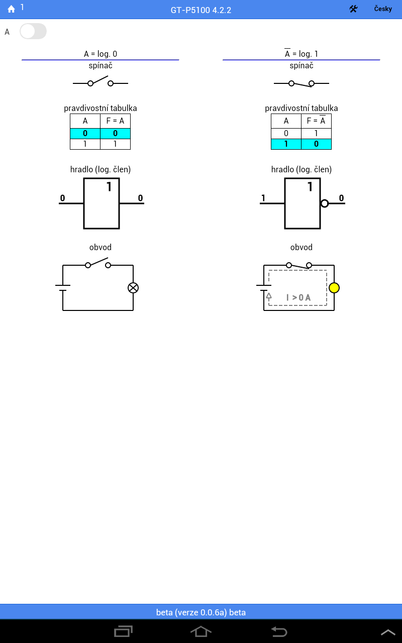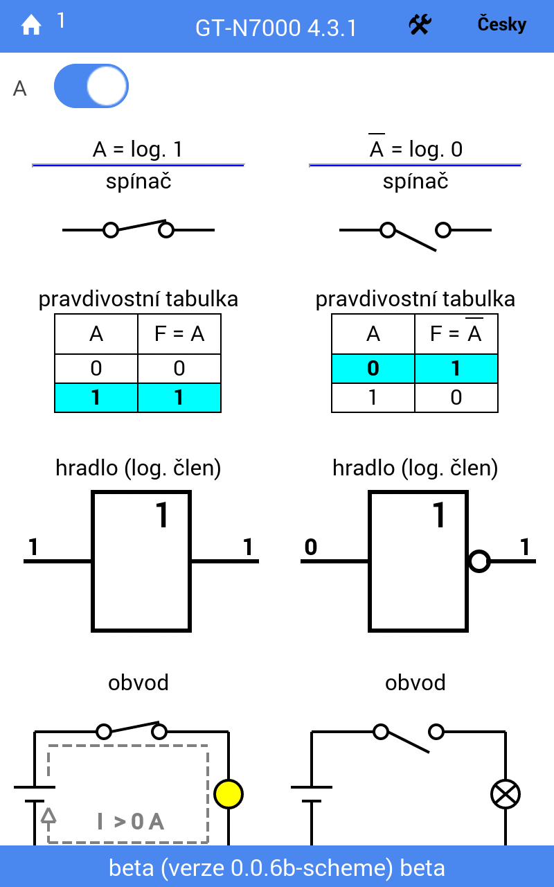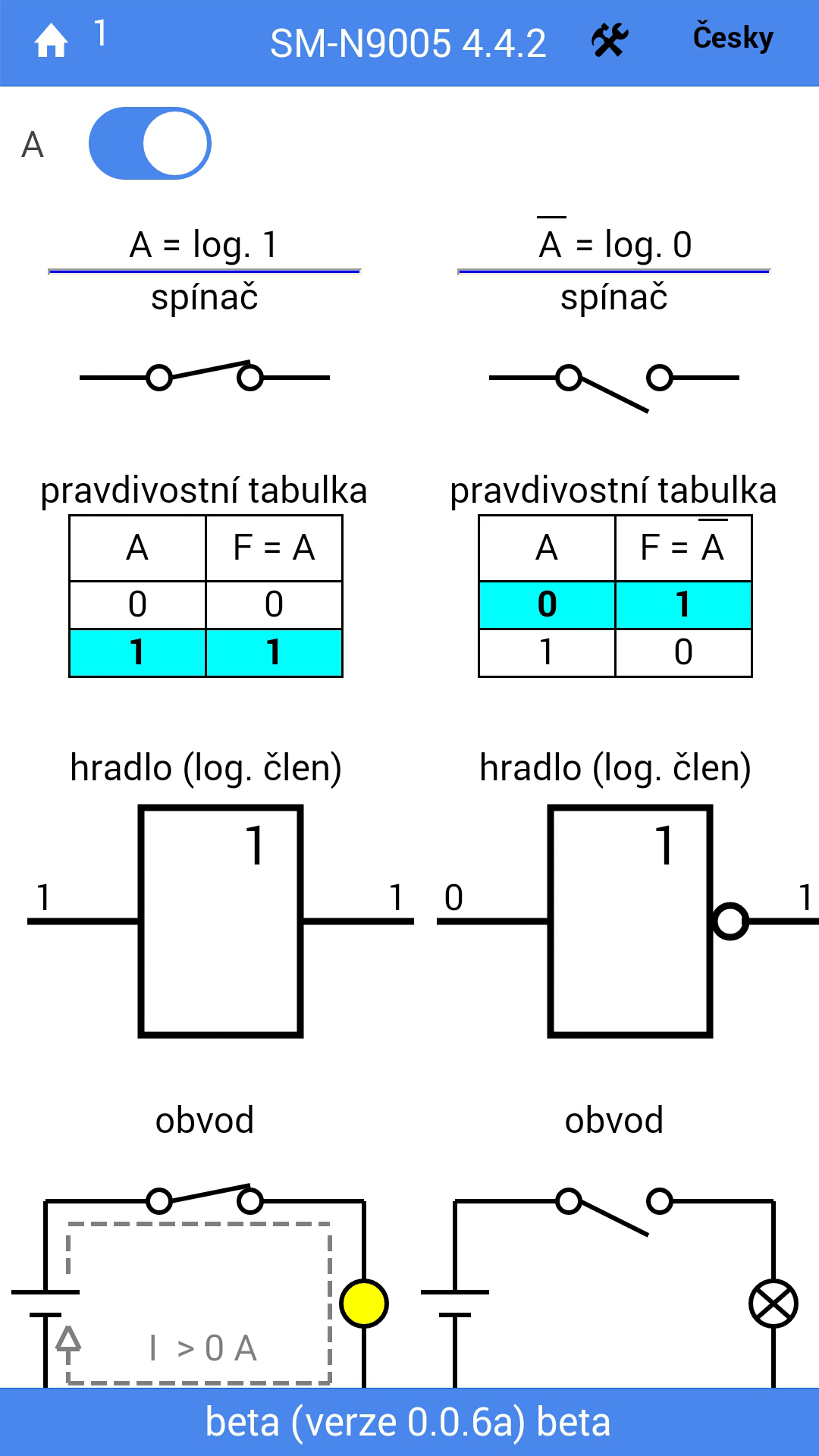 Aplikace pro práci se základními logickými funkcemi. Obsahuje: log. proměnná jako spínač, pravd. tabulka, hradlo (log. člen), obvod. Dále funkce dvou log. proměnných OR, AND, XOR, NOR, NAND, XNOR, pravd. tab., hradla, hradla + LED.