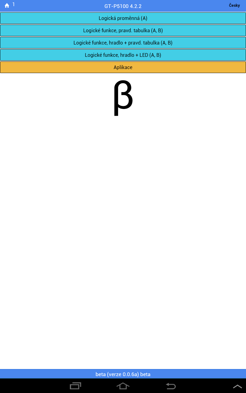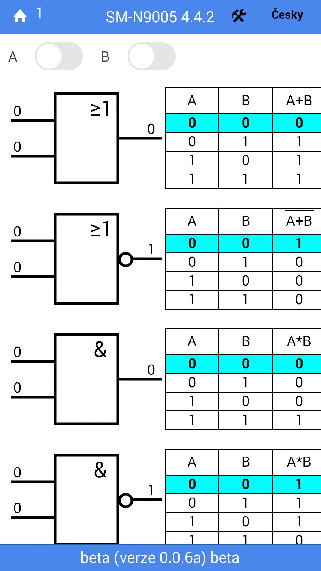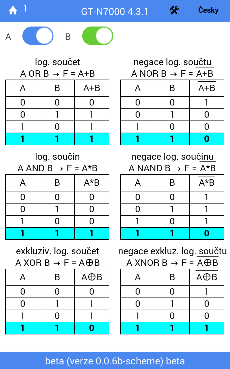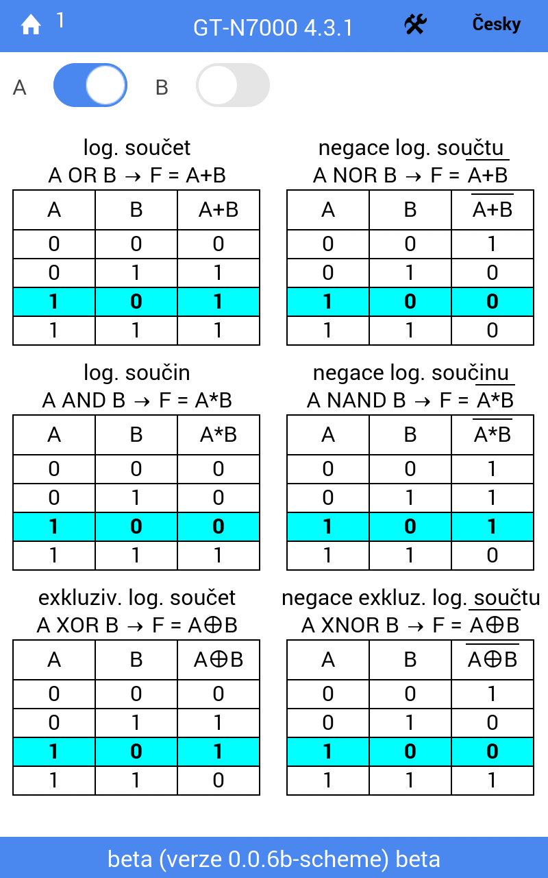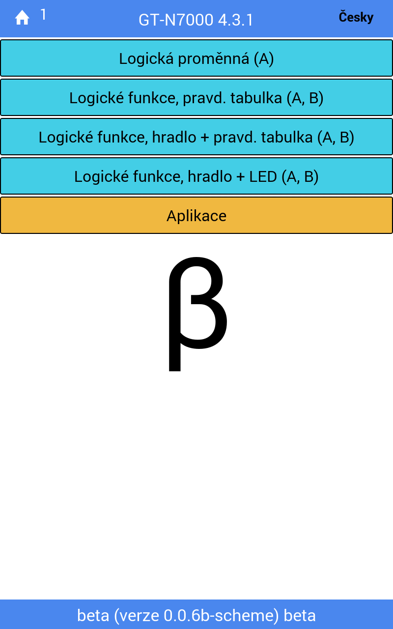 Aplikace pro práci se základními logickými funkcemi. Obsahuje: log. proměnná jako spínač, pravd. tabulka, hradlo (log. člen), obvod. Dále funkce dvou log. proměnných OR, AND, XOR, NOR, NAND, XNOR, pravd. tab., hradla, hradla + LED.