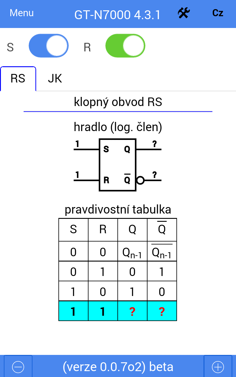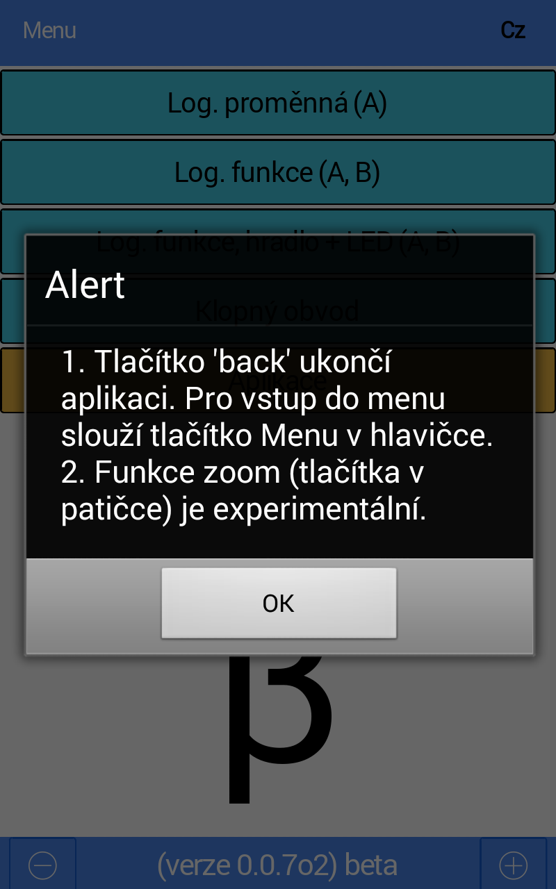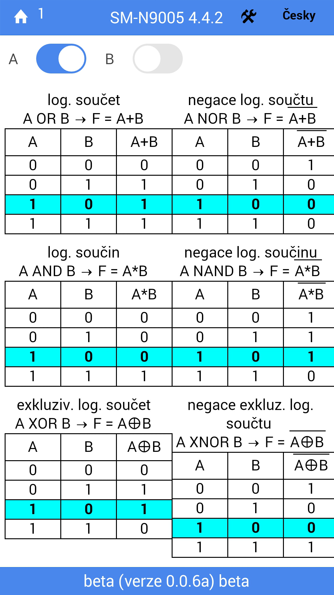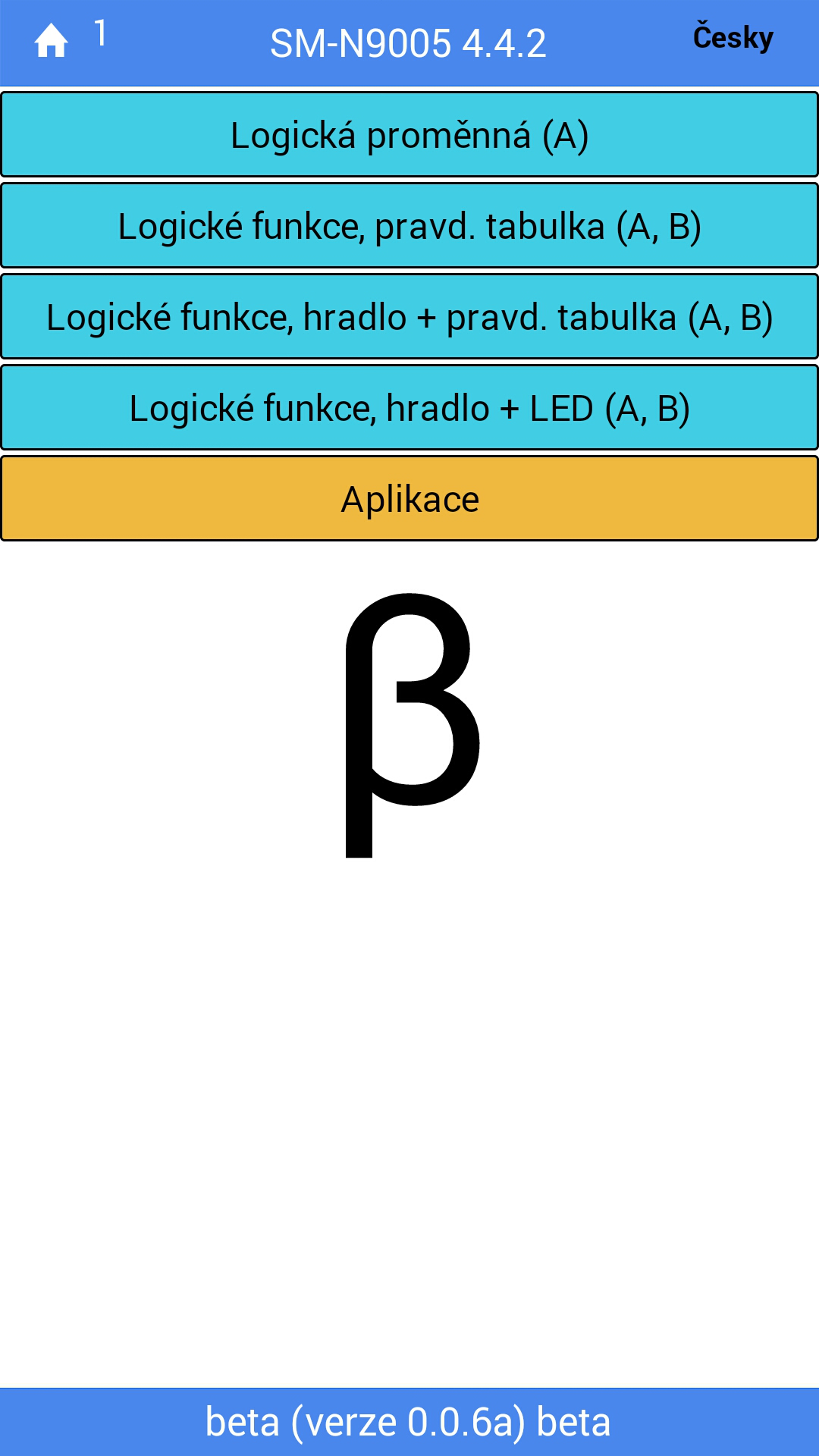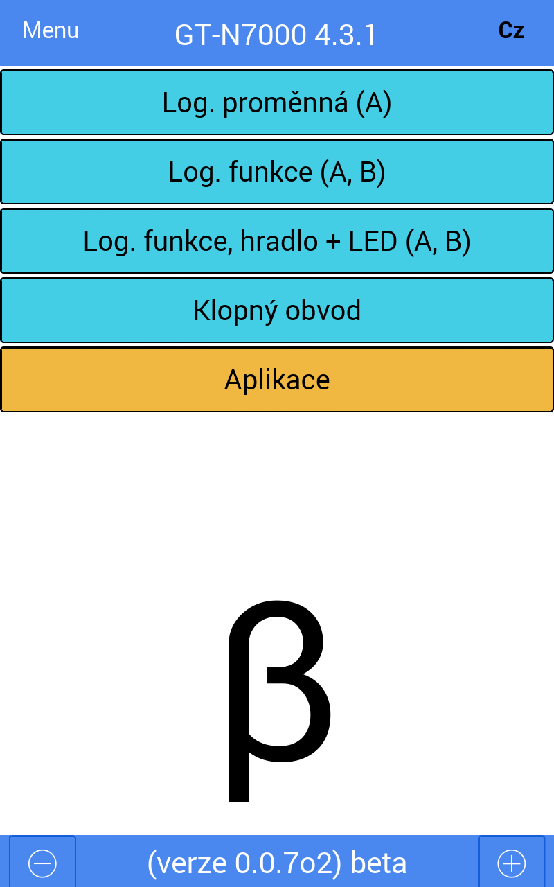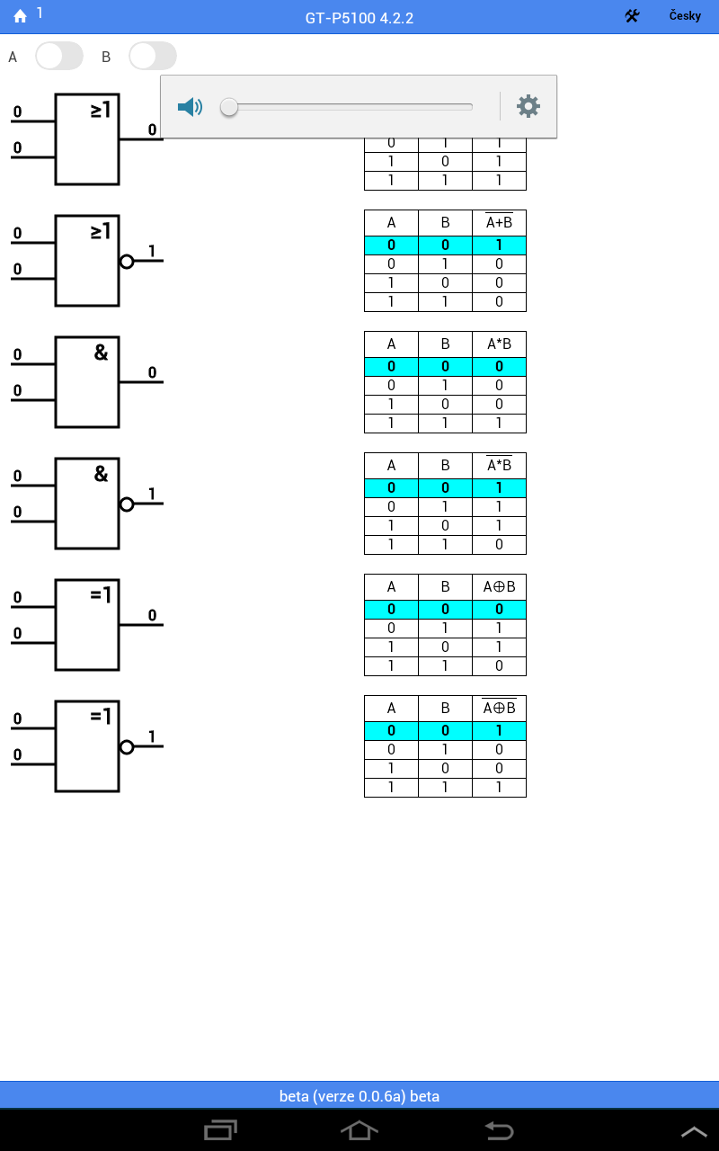 Aplikace pro práci se základními logickými funkcemi. Obsahuje: log. proměnná jako spínač, pravd. tabulka, hradlo (log. člen), obvod. Dále funkce dvou log. proměnných OR, AND, XOR, NOR, NAND, XNOR, pravd. tab., hradla, hradla + LED.