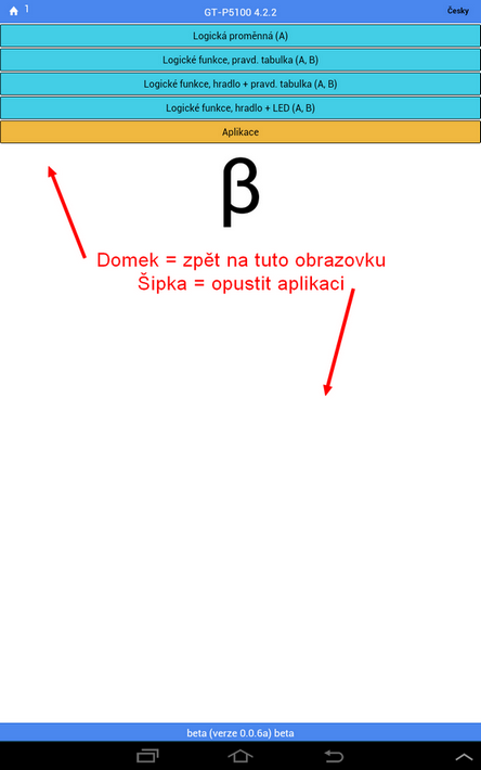 Pro návrat do menu aplikace slouží tlačítko Home v hlavičce aplikace; stisk tlačítka "Back" aplikaci ukončí.