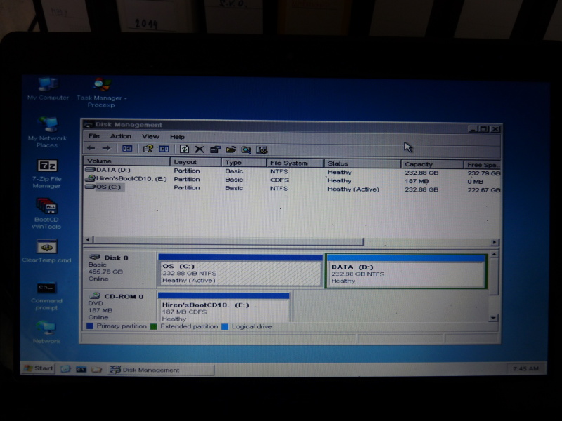 V XP mini, v Disk Management vidím disky C (OS) i D (data), C je "Primary Partition", "Healthy", "Active".