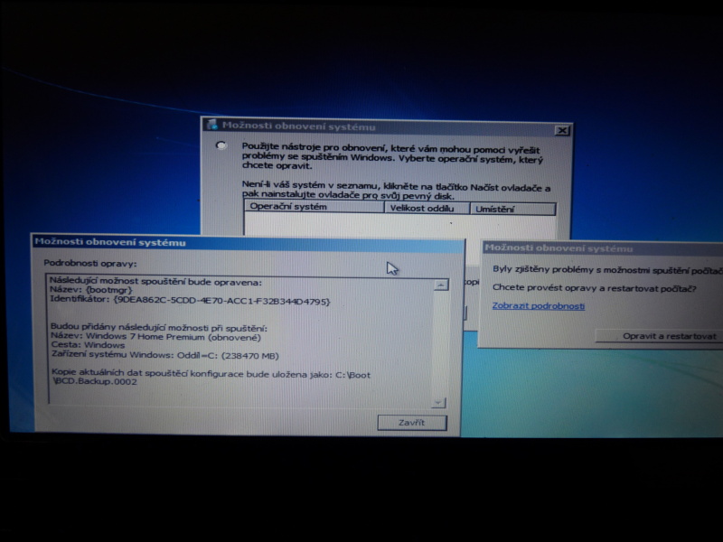Po "Opravit a restartovat" pořád W7 nejsou bootovatelné, informace prý není možné zapsat.