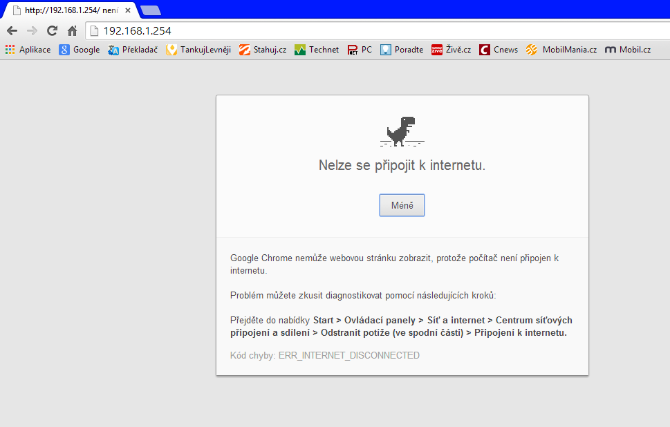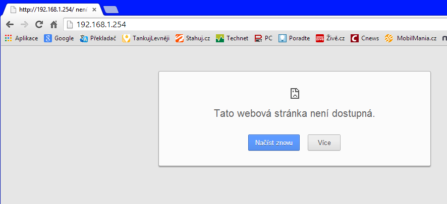 Dobrý den, mám router ZCOMAX typ WA-2204A-TX. Do prohlížeče jsem nastavil adresu 192.168.1.254, ale na této adrese se do routeru nemohu dostat. Prohlížeč mi napíše "Tato webová stránka není dostupná". Vyzkoušel jsem prohlížeč jak Google Chrome, tak i Internet Explorer a výsledek je pořád stejný - do routeru se nedostanu. Přikládám výstřižek. Používám jinak OS Windows 8.1 - 32 bit.
