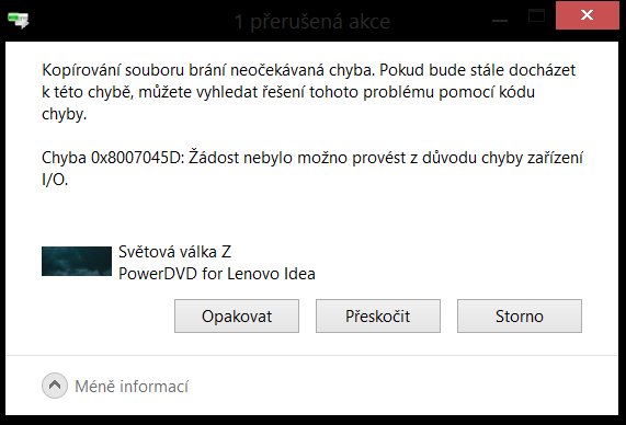 Mám problém ohledně přesouvání souborů na flashku, když chci něco přesunout, konkrétně film, rychlost přesouvání postupně klesá a na 33% se zastaví úplně, chvíli počkám a vyhodí to chybu "Chyba 0x8007045D: Žádost nebylo možno provést z důvodu chyby zařízení I/O" zkoušel jsem formátovat flashku ale nepomohlo..