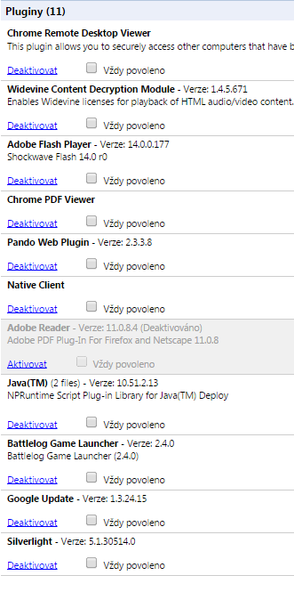 Dále v chrome://plugins/ si zkontroluj, jestli nemáš na flash nainstalované dva pluginy (jeden vypni).