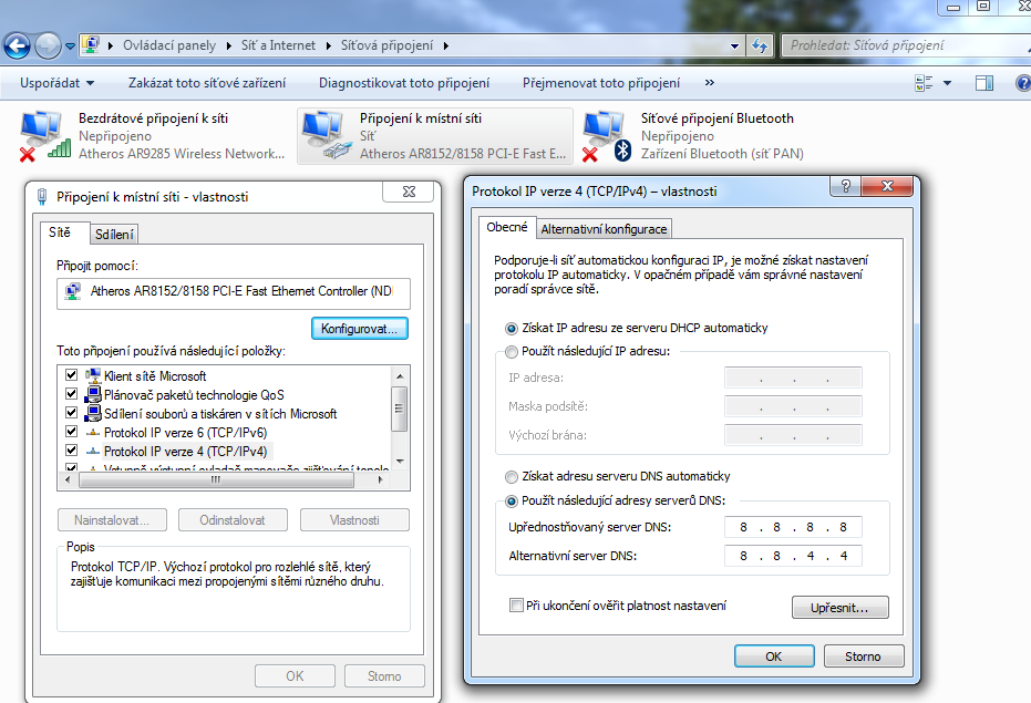 Počítač jsem projel CCleanerem i AdwCleanerem, založil kompletně nový a čistý profil - žádný výsledek. Nemáte ještě jiné návrhy? Změnu DNS jsem nikdy nedělal a vůbec netuším, jestli ovlivňuje další počítače, které mám doma (hádám že ne). Když použiji návod z liane.tul.cz a dostanu se k 2. obrázku (vlastnosti protokolu IP verze 4 a 6 ve Windows 7), stačí do ip adresy u verze 4 zadat 8.8.8.8 a u verze 6 8.8.4.4? Dá se stručně popsat, jak změnou DNS ovlivním použitelnost internetu?