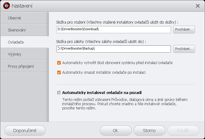 - default má zatrženou tichou instalaci ovladačů na pozadí.