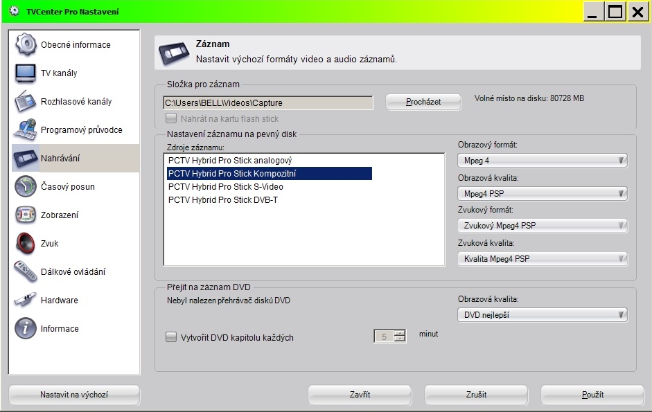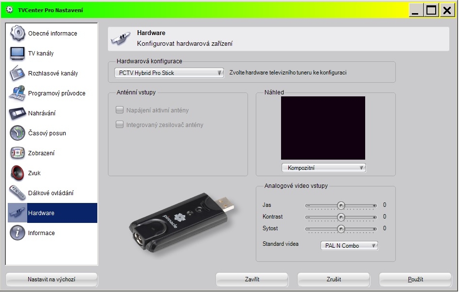 Od toho Pinnacle v nastaveni HARDWARE ukáže malý náhled. A tam se i vidim, jak se tlemím...