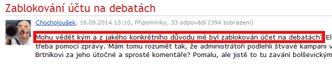 Mohu vědět kým a z jakého konkrétního důvodu mě byl zablokován účet na debatách? Elementární slušností je alespoň sdělit důvod - třeba pomocí zprávy. Mám tomu rozumět tak, že administrátoři podlehli štvavé kampani vůči mé osobě? Byl taktéž zablokován účet Brtníkovi za jeho útočné a sprosté komentáře? Pomalu, ale jistě to tu zavání bolševickými praktikami, které tak odsuzujete!