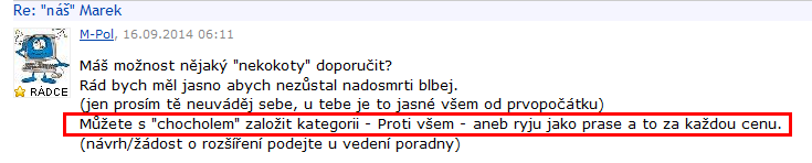 Narozdíl od ostatních serverů typu Živě, Novinky, Neviditelný pes, a podobných je tu diskuze obvykle udržována na kultivované úrovni i díky údržbě ze strany moderátorů (za což jim obrovské poděkování). Poslední dobou sem ale infiltrovalo několik podivnůstek typu Chocholouška, Kruelaa, a jiných nedoceněných géniú, které si zde honí uražené ego, navážejí se do dlouhodobých (a svými hodnotnými radami zasloužilých členů)a dělají z těchto stránek zasmrádlou a hnijící louži. Abych se přiznal, díky těmto lidem upadá i má účast zde. Vím že svět není černobílý a doufám že Poradna a všechny přidružené stránky si i díky BANům zachovají dobrou úroveň a uživatelé se sem budou rádí/y vracet.