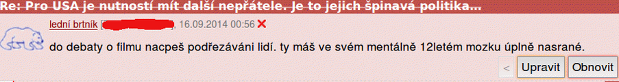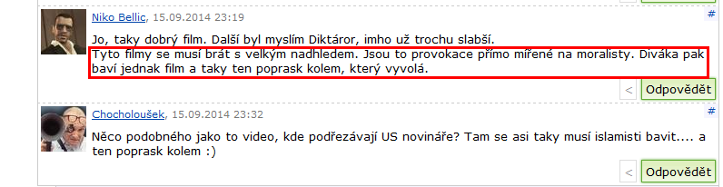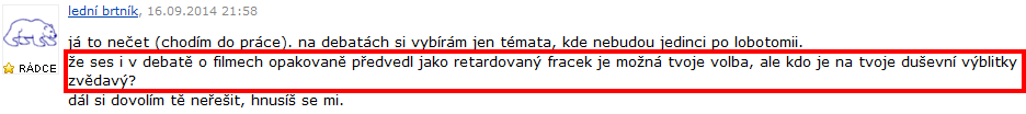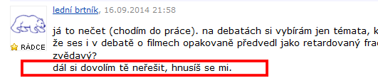 Ovšem, další "moderátor", který absolutně ignoruje, že nám do této "zábavné debaty o filmech", jehož tazatele mnozí považovali přinejmenším za ožralého, vniknul provokatér brtník s urážkama, což byl také jeho jediný příspěvek k debatě. U jiných debat mu offtopic - reakce na samotné autory samozřejmě nevadí. Proč? Jednoduše - protože Chocholoušek.