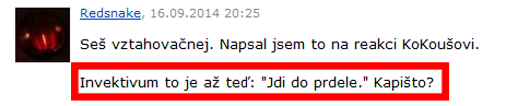Seš vztahovačnej. Napsal jsem to na reakci KoKoušovi. Invektivum to je až teď: "Jdi do prdele." Kap…