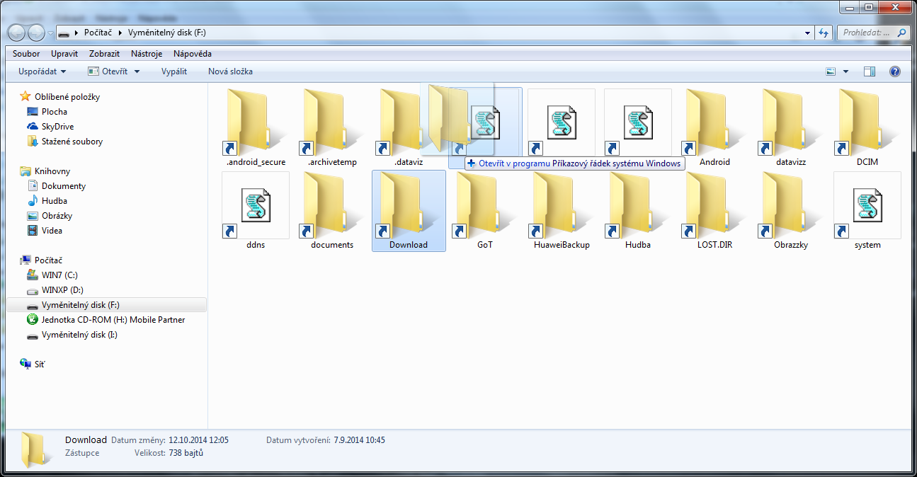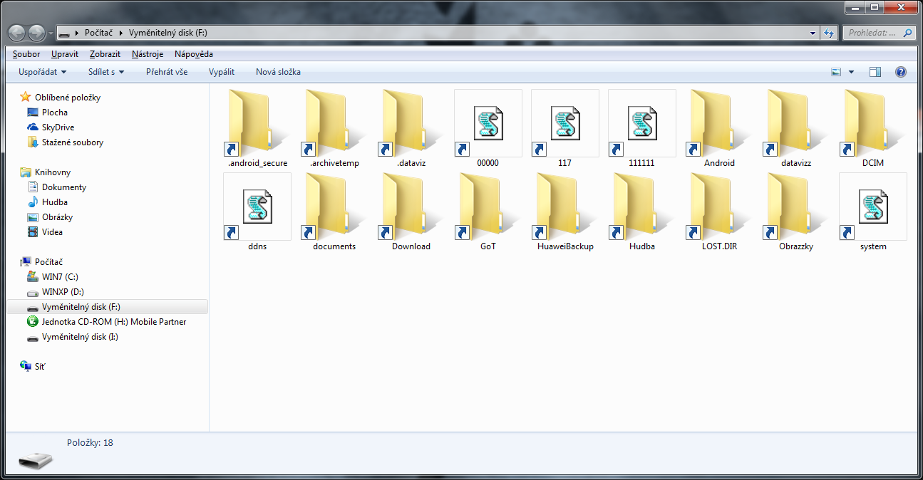 Dobrý den. Mám problém, který nedokážu pořádně popsat. Když do počítače vložím jakýkoliv vyměnitelný disk a otevřu jeho složku, je plná podivných souborů, které nejdou nijak odstranit. Snažil jsem se zjistit co to má znamenat, ale přišel jsem jen na to, že to má ěnco společného s příkazovým řádekem systému windows... Nevím co s tím... Děkuji za radu.