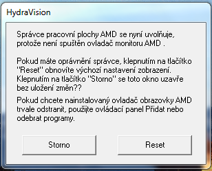 Storno,odinstaluj hydravision ovladace,jelikoz ti jsou naprd.Pochybuju,ze potrebujes spoustet ruzne aplikace na jinych monitorech.Odinstaluj a mas klid.