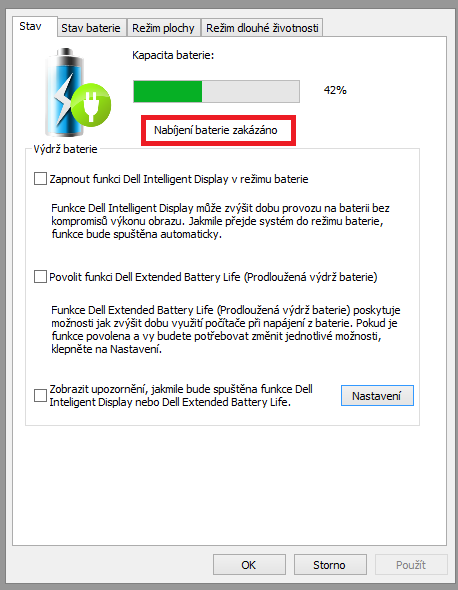 Dobrý podvečer, rád bych se Vás zeptal, zda nevíte co s tímto problémem - Mám notebook Dell Inspiron 15R a můj problém spočívá v tom, že se mi baterie nabijí pouze na 42% a poté mi píše "napájen ze sítě,nenabíjí se" . Na práci s ntb nejsem žádný odborník, tak se omlouvám jestli je to jen nějaká "prkotina"