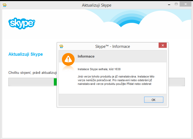 Dobrý den.Mám W8.1 a skype předposlední verzi.Pár dní mi pořád vyskakuje okno Aktualizovat nyní když to dám ,tak se spustí instalace a po chvíli mi to napíše (viz. obrázek).Nevím jak dál.Zkoušel jsem odinstalovat ten skype co mám ,ale není v seznamu (Přidat ,nebo odebrat programy).Odstranil jsem teda složku v program files ,ale nepomohlo to.Ani starší verze nejdou píše to pořád to stejné.Děkuji za případné odpovědi.