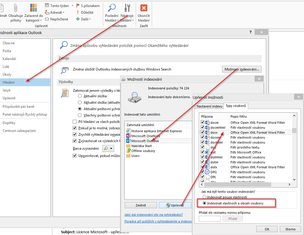 Přesně na tohle jsem koukal a všechno je tam zaškrtlé.. Nicméně trochu poupravím zadání, v .XLS souborech mi to opravdu taky jde vyhledávat, ale zapomněl jsem, že to co mi nejde jsou přípony .CSV , které se nicméně otevírají v EXCELu ale ačkoliv i tuhle příponu mám v indexování outlooku zaškrtlé, tak mi to nevyhledává, ale se starým Officem 2007 mi to hledalo bez jakéhokoliv mého zásahu do nastavení... :(