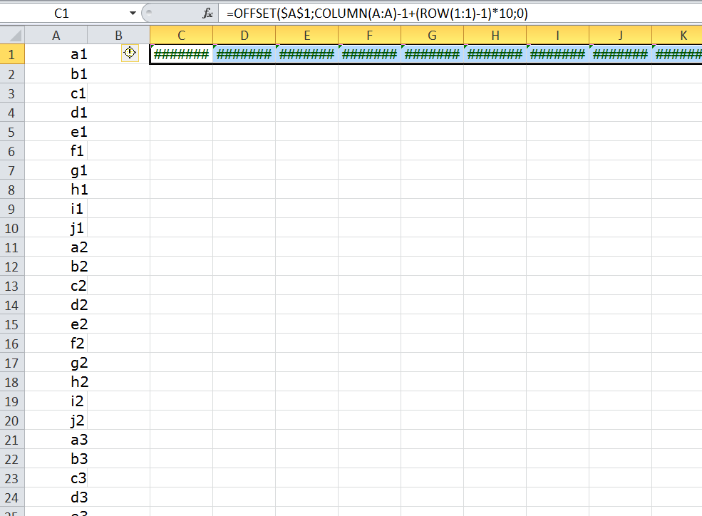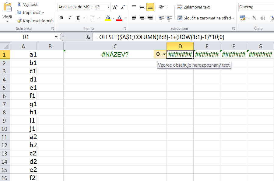 Po importe budeš mať v stĺpci A importované hodnoty. Do bunky C1 si napíšeš nasledovný vzorec, ktorý potom rozkopíruješ do tých desiatich stĺpcov: