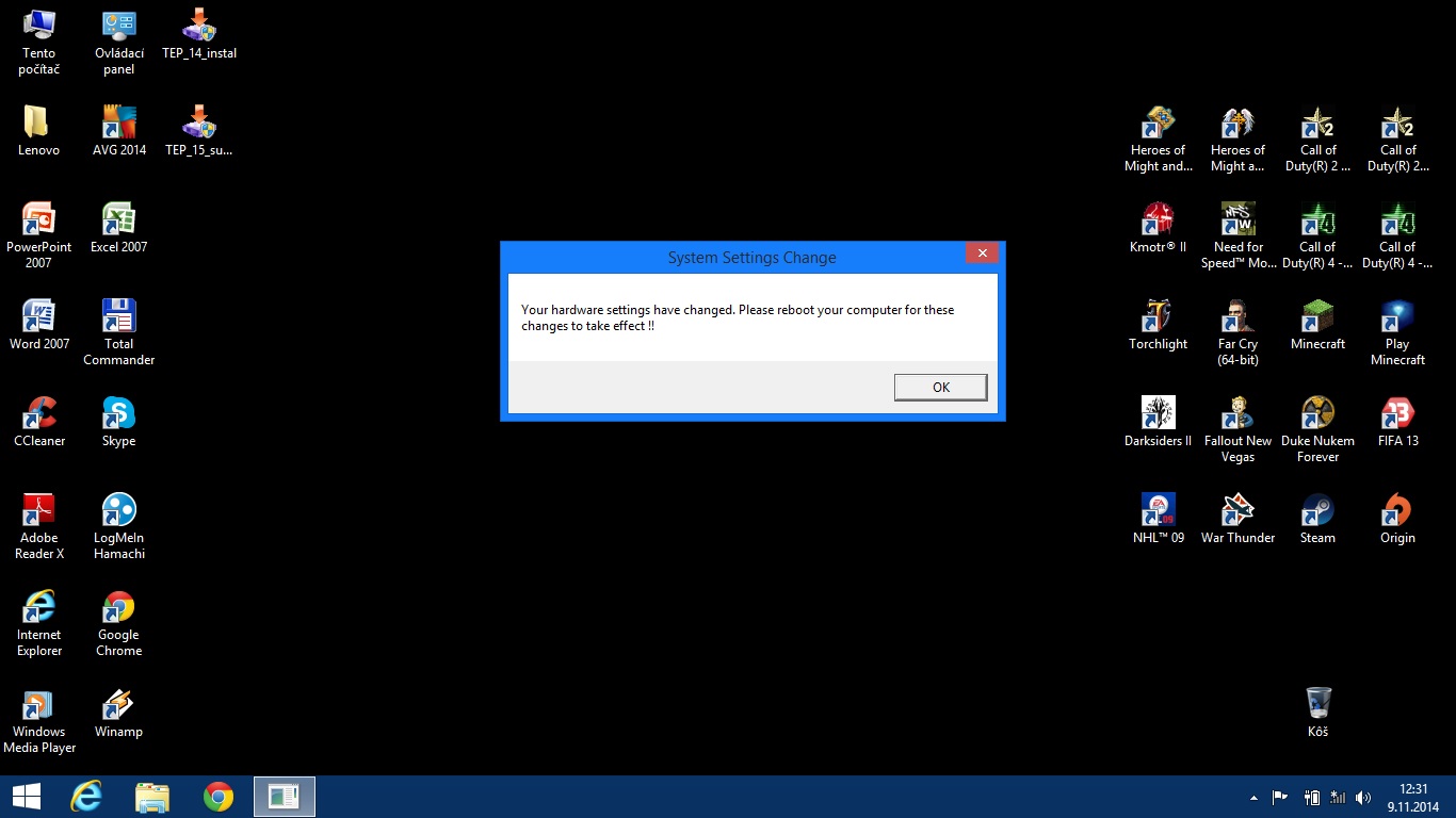 1. To ze ti ypisalo tu hlasku ze sa ti zmenil HW a ze musis restartovat PC = no tak ho restartuj.