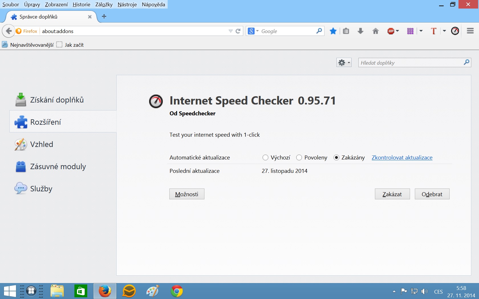 Dobrý den. Stále se nemůžu zbavit doplňku Internet Speed Checker. Nejdříve jsem jej odebral z doplňků. Odebral z lišty. Restartoval PC. Za dva dny se mi objevil na PC na liště i ve správcích doplňků zase. Pak jsem jej místo odebrání v doplňcích zakázal + restart, ale nepomohlo to. Opět jej mám na PC. Dokonce jsem zakázal aktualizace, ale také to není nic platné, protože se mi dnes 27.11. doplněk aktualizoval. Prosím o radu, jak bych měl postupovat. Děkuji.